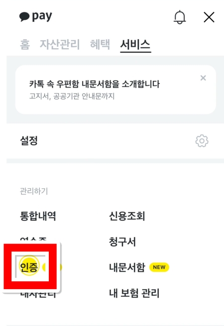 4. 서비스 화면에는 여러 가지 관리 항목들이 나열되어 있습니다. 그중에서 온라인상의 신분증 역할을 하는 인증서를 발급하고 관리할 수 있는 '인증' 메뉴를 찾아 눌러주세요.