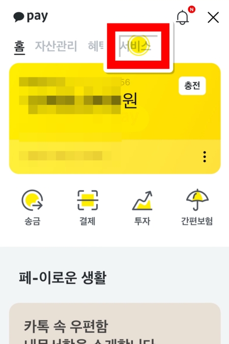 3. 카카오페이 홈 화면이 나타나면, 상단에 있는 여러 메뉴 중에서 '서비스'를 선택해 주세요. 이곳에서는 송금이나 결제 외에 다양한 금융 관련 편의 기능들을 확인할 수 있습니다.