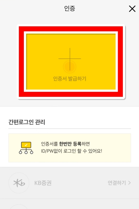 5. 인증 메뉴로 들어오면 커다란 노란색 카드 모양의 '인증서 발급하기' 안내를 볼 수 있습니다. 이 부분을 눌러 본격적인 발급 절차를 시작해 주세요.