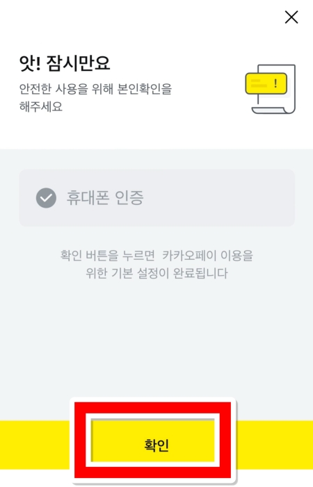 9. 휴대폰으로 전송된 인증번호를 정확하게 입력하면 본인 확인이 완료되었다는 안내가 나타납니다. 화면 아래의 '확인'을 눌러주시면 기본적인 설정이 마무리됩니다.