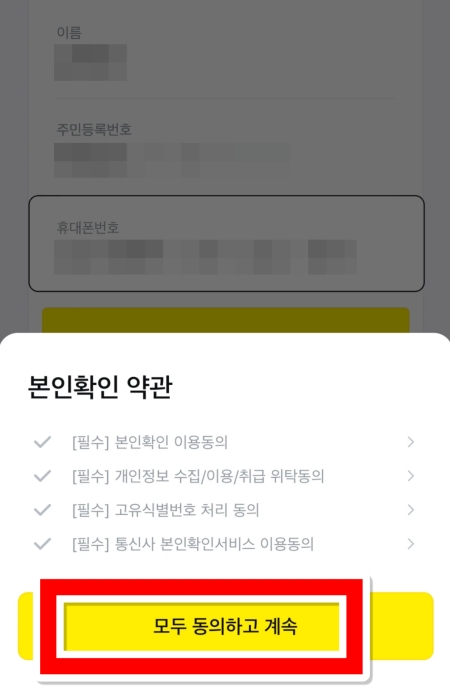 8. 인증번호를 요청하면 서비스 이용에 필요한 약관 동의 절차가 나타납니다. 내용을 확인한 후, 아래에 있는 '모두 동의하고 계속'을 눌러 다음 단계로 넘어가 주세요.