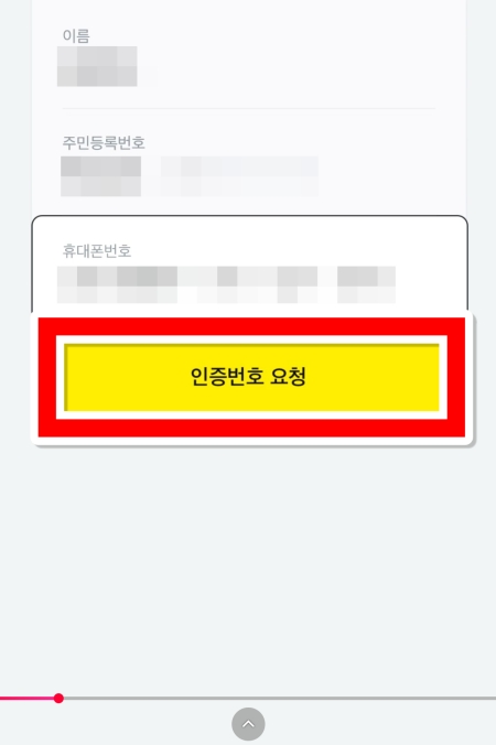 7. 모든 정보를 올바르게 입력했는지 다시 한번 확인한 후, 화면 아래에 있는 '인증번호 요청'을 눌러주세요. 잠시 후 입력한 휴대폰 번호로 인증을 위한 문자가 발송됩니다.