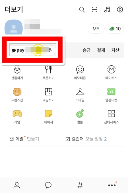 2. 더보기 화면으로 이동하면 상단에 내 프로필과 함께 'pay'라는 글씨와 함께 현재 잔액이 표시된 부분을 볼 수 있습니다. 이 부분을 눌러 카카오페이의 상세 메뉴로 진입해 주세요.