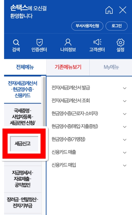 5. 전체 메뉴 화면에서 왼쪽에 보이는 여러 분류 중에서 '세금신고'를 선택해 주세요. 컴퓨터에서와 마찬가지로 각종 세금 신고와 관련된 메뉴들을 이곳에서 이용할 수 있습니다.
