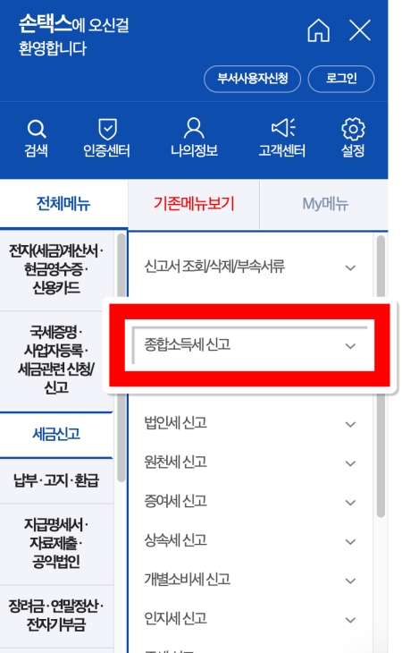 6. 세금신고와 관련된 여러 항목들이 나타나면, 그중에서 '종합소득세 신고'라고 표시된 부분을 선택해 주세요. 그러면 아래로 숨겨져 있던 세부 메뉴들이 펼쳐지게 됩니다.