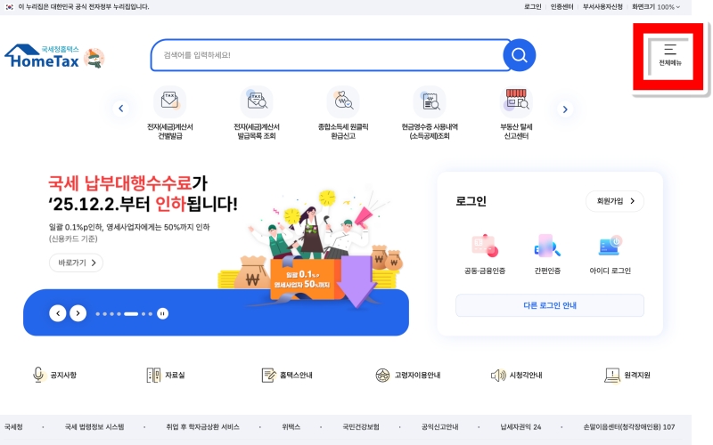 1. 국세청 홈택스 홈페이지에 접속하신 후, 오른쪽 맨 위에 있는 '전체메뉴'를 선택해 주세요. 그러면 홈택스에서 이용할 수 있는 모든 서비스 목록이 한눈에 펼쳐집니다.