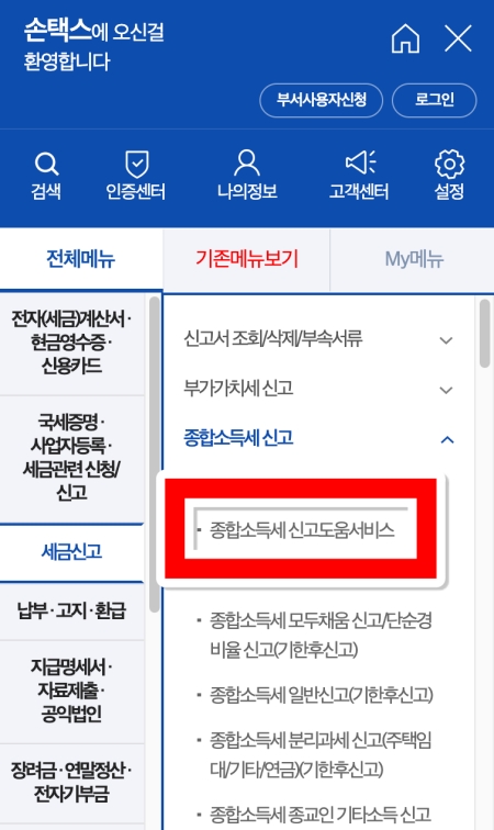 3. 세금신고 메뉴로 들어오셨다면, 다양한 세금 종류 중에서 '종합소득세' 항목을 찾아주세요. 그리고 그 아래에 있는 여러 소메뉴 중 '신고도움 서비스'를 선택하면 대상 여부를 확인할 수 있습니다.