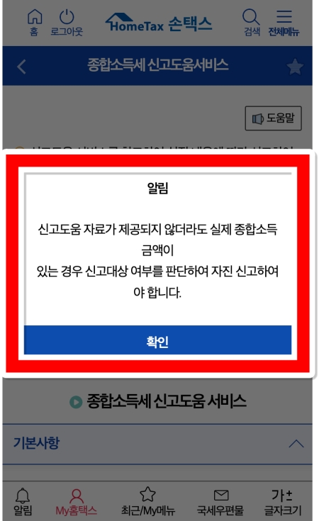 8. 서비스를 이용하기 전에 안내창이 하나 나타납니다. 신고도움 자료가 없더라도 실제 소득이 있다면 스스로 판단하여 신고해야 한다는 내용이니, '확인'을 눌러 내용을 숙지해 주세요.