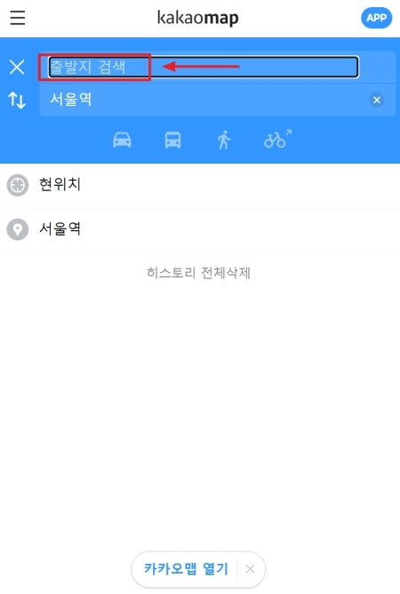 6. 출발지와 도착지 설정이 모두 끝났습니다. 이제 자동차, 대중교통, 도보, 자전거 모양의 아이콘 중에서 원하는 이동 수단을 선택할 차례입니다.
