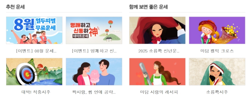 7. 띠별 운세 외에도 월간 궁합이나 타로, 애정운 등 다채로운 콘텐츠가 준비되어 있어요. 운세 이야기나 꿈 해몽처럼 평소 궁금했던 소소한 이야기들도 이곳에서 찾아볼 수 있습니다.