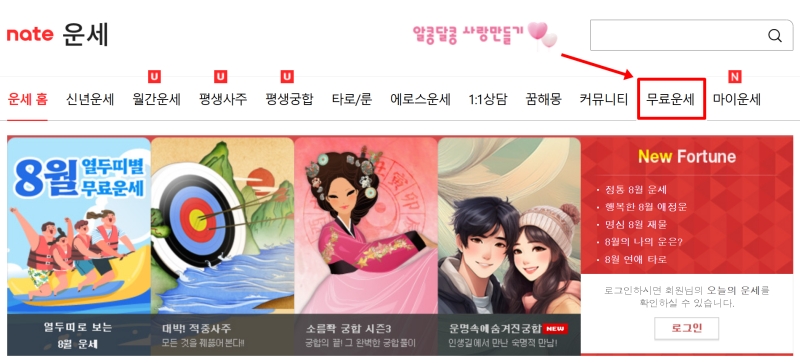 1. 홈페이지 상단에 있는 여러 운세 메뉴 중에서 '무료운세'를 선택하면 부담 없이 즐길 수 있는 다양한 운세 정보의 세계가 펼쳐져요. 이곳에서 궁금했던 여러 운세를 마음껏 탐색해 볼 수 있습니다.