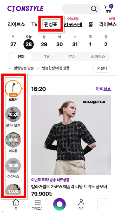 3. '편성표'를 선택하면 오늘을 포함한 요일별 방송 스케줄을 미리 확인할 수 있습니다. 시간대별로 어떤 상품들이 방송될 예정인지 목록으로 보여주어, 관심 있는 상품의 방송 시간을 놓치지 않도록 계획할 수 있습니다.