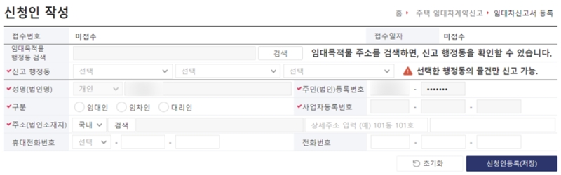 3. 로그인 후에는 신청인 정보를 작성하는 화면이 나타납니다. 임대차 목적물의 주소지를 검색하여 행정동을 확인하고, 임대인이나 임차인 등 본인의 구분을 선택한 뒤 나머지 정보를 정확하게 기입합니다.
