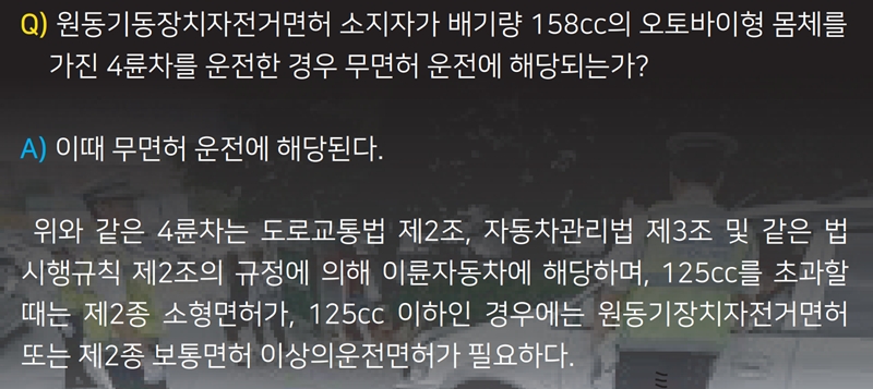 5. 또한, 원동기장치자전거 면허만 가진 사람이 125cc를 초과하는 158cc 오토바이를 운전하는 경우도 마찬가지로 무면허 운전에 해당합니다. 125cc를 초과하는 이륜자동차는 제2종 소형면허가 필요하기 때문입니다.