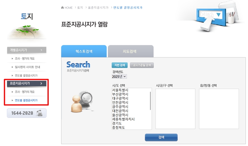 6. 토지의 공시지가를 확인하려면, 메뉴에서 '표준지공시지가' 또는 '연도별 결정공시지가'를 선택합니다. 이후 검색하고자 하는 토지의 주소를 입력하여 조회할 수 있습니다.