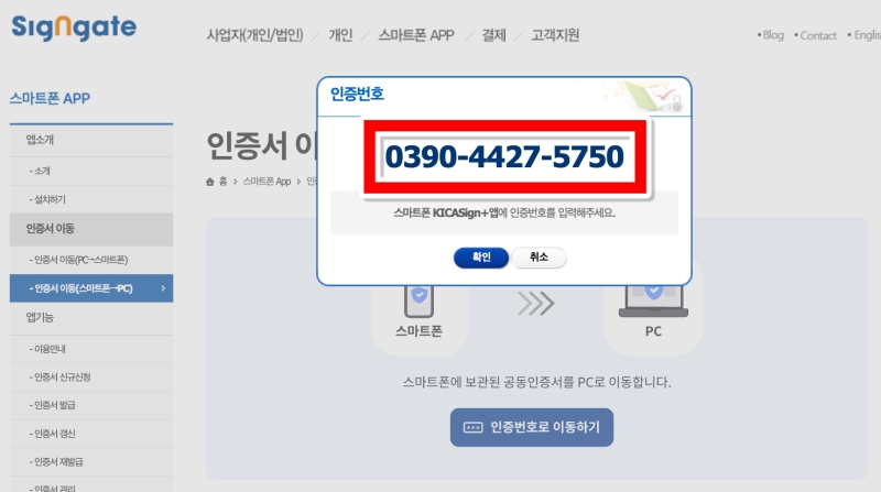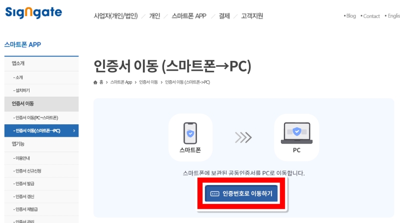 3. 이제 컴퓨터에서 Signgate 홈페이지에 접속해 '인증서 이동(스마트폰→PC)' 메뉴를 찾으세요. 그리고 화면에 나타나는 '인증번호로 이동하기'를 선택해 다음 단계로 진행합니다.