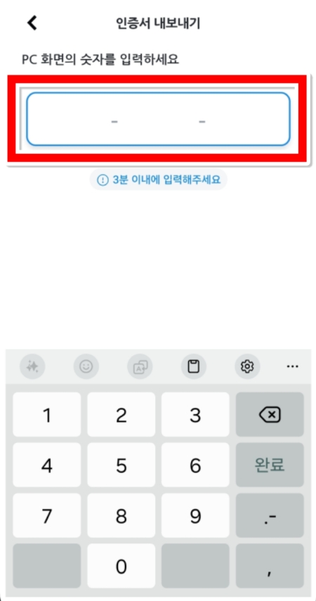 5. 다시 스마트폰 앱으로 돌아와, PC 화면에 표시된 12자리 인증번호를 빈칸에 정확하게 입력해주세요. 3분 안에 입력해야 하므로 신속하게 진행하는 것이 좋습니다.