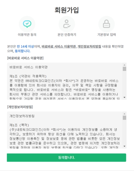 5. 회원가입 절차는 서비스 이용약관과 개인정보처리방침에 동의하는 것부터 시작됩니다. 내용을 꼼꼼히 확인하신 후 '동의합니다'를 선택하여 계속 진행해주세요.