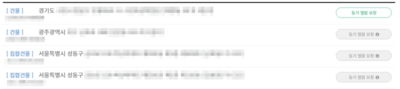 3. 검색을 마치면 입력한 주소와 일치하는 부동산 목록이 나타납니다. 이 중에서 확인하려는 건물의 오른쪽에 있는 '등기 열람 요청'을 선택하여 다음 단계로 넘어갑니다.