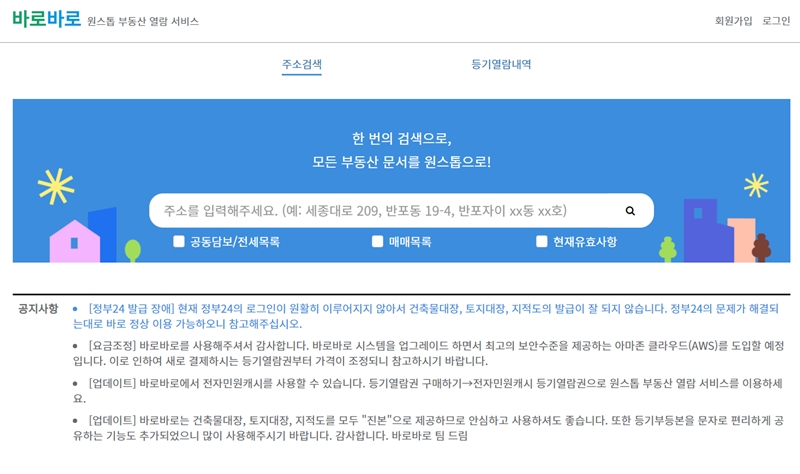 관심 있는 토지의 권리 관계나 현황을 파악하기 위해 등기부등본 열람은 필수적인 과정입니다. 여러 사이트를 방문할 필요 없이 한 곳에서 모든 정보를 조회할 수 있다면 정말 편리할 텐데요. 토지 등기부등본 무료 열람은 바로바로 홈페이지의 신규 회원 혜택을 통해 이용해 볼 수 있습니다.