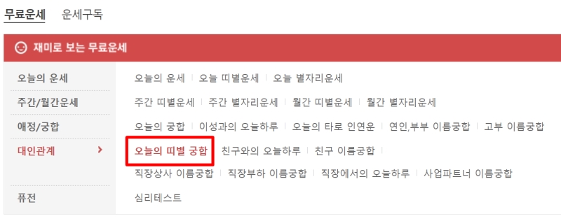 2. 무료운세 코너 속 '대인관계' 항목을 보면 '오늘의 띠별 궁합'이 있어요. 이를 통해 태어난 띠를 기준으로 다른 사람과의 관계 합을 미리 재미 삼아 알아볼 수 있어 흥미로운 경험이 될 거예요.