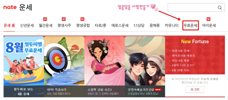 1. 홈페이지 상단에 있는 여러 메뉴 중 '무료운세'를 선택하면 별도의 비용 없이 누구나 즐길 수 있는 다양한 운세의 세계로 들어갈 수 있어요. 이곳에서 궁금했던 여러 정보들을 마음껏 살펴볼 수 있습니다.