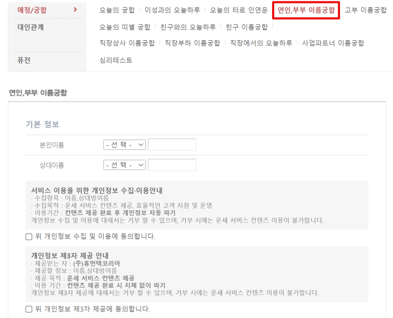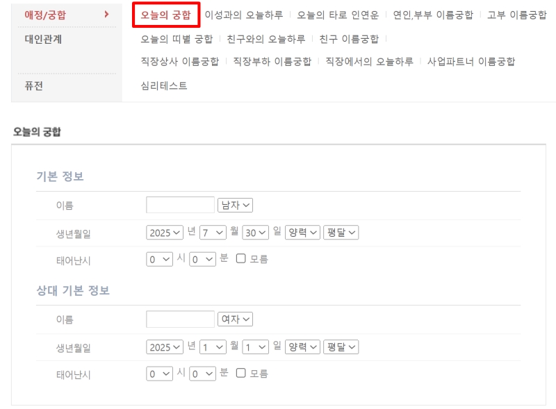 5. 띠별 궁합 외에 좀 더 자세한 오늘의 궁합이 궁금하다면 '애정/궁합' 메뉴의 '오늘의 궁합'을 이용해 보세요. 이곳에서는 이름과 생년월일 같은 기본 정보를 바탕으로 한층 더 구체적인 궁합을 알아볼 수 있습니다.