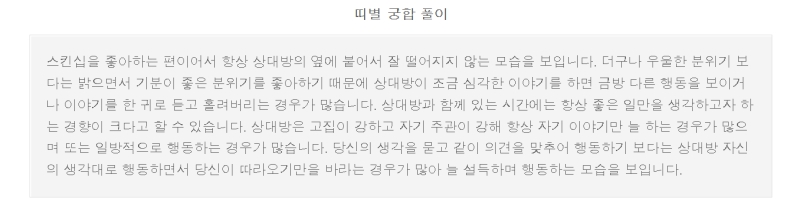 4. 두 사람의 띠를 모두 선택하고 나면, 아래에서 둘의 관계에 대한 자세한 풀이를 읽어볼 수 있습니다. 서로의 어떤 점이 잘 맞고 어떤 점을 조심하면 좋을지 알려주어 관계를 이해하는 데 작은 도움이 될 수 있어요.