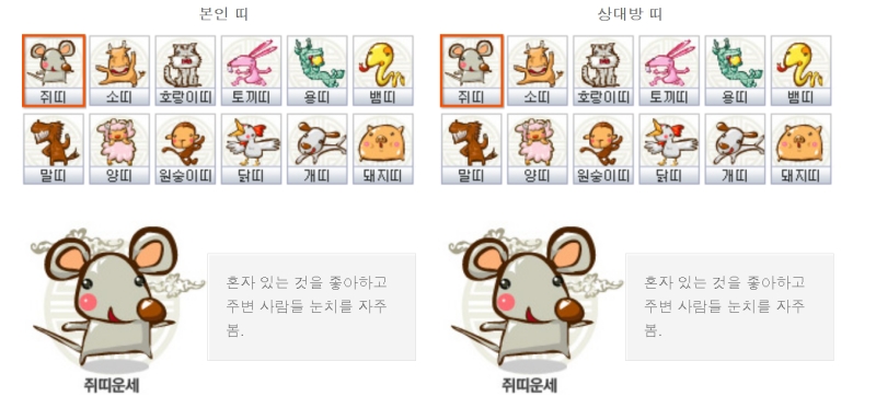 3. 자신의 띠와 상대방의 띠를 각각 선택하면 각 띠가 가진 기본적인 성향에 대한 간단한 설명을 바로 볼 수 있어요. 예를 들어 쥐띠는 혼자 있는 것을 좋아하고 주변 사람들의 눈치를 자주 본다고 하네요.