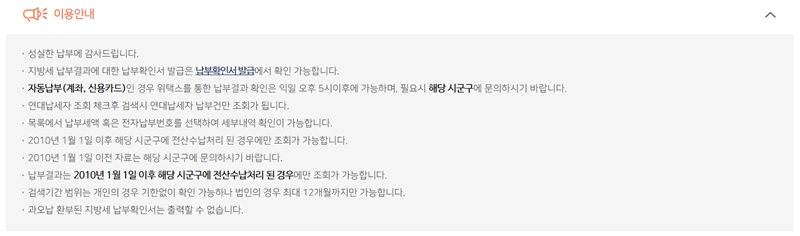7. 이용안내에 따르면 자동이체를 통한 납부 결과는 다음 날 오후 5시 이후에 확인이 가능하며, 개인의 경우 최대 12개월까지의 내역을 조회할 수 있으니 참고하시길 바랍니다.