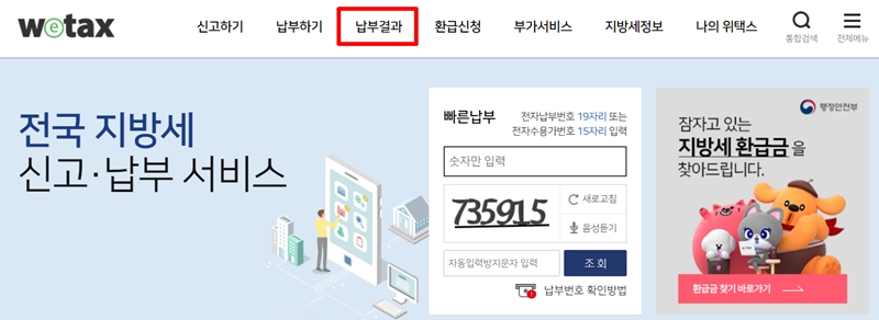 1. 위택스 홈페이지에 접속한 후, 상단 메뉴 중 '납부결과'를 선택해 주세요. 이곳에서 각종 지방세의 납부 결과를 확인할 수 있는 메뉴들로 이동하게 됩니다.
