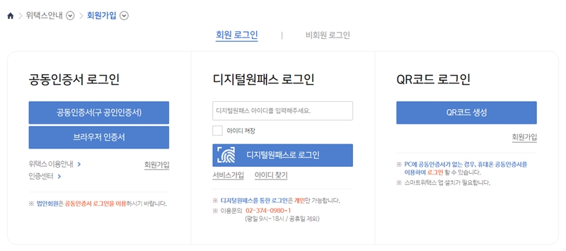3. 개인의 납부 정보를 확인하기 위해서는 로그인이 필요합니다. 공동인증서(구 공인인증서), 디지털원패스 등 자신이 사용하기 편한 방법을 선택하여 로그인을 진행해주세요.