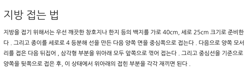 6. 지방을 쓰는 종이는 가로 약 25cm, 세로 약 40cm 크기의 깨끗한 한지나 백지를 준비합니다. 종이의 윗부분 양쪽 모서리를 접거나 잘라 위패와 비슷한 모양으로 만들어 사용합니다.