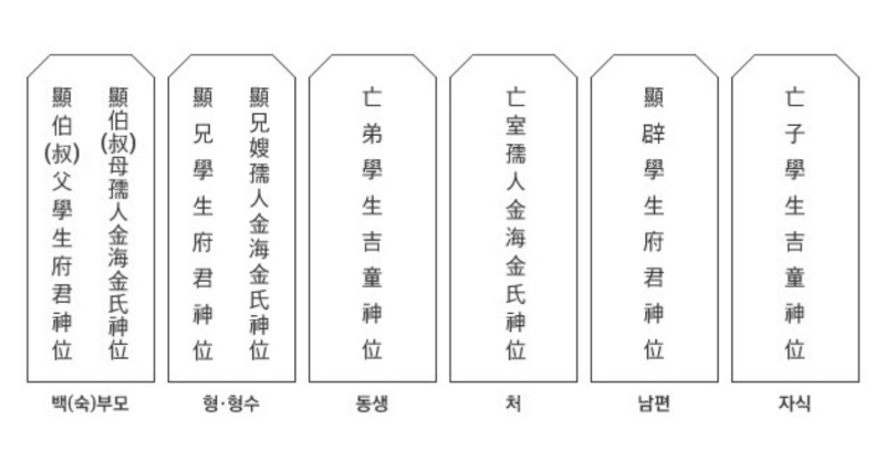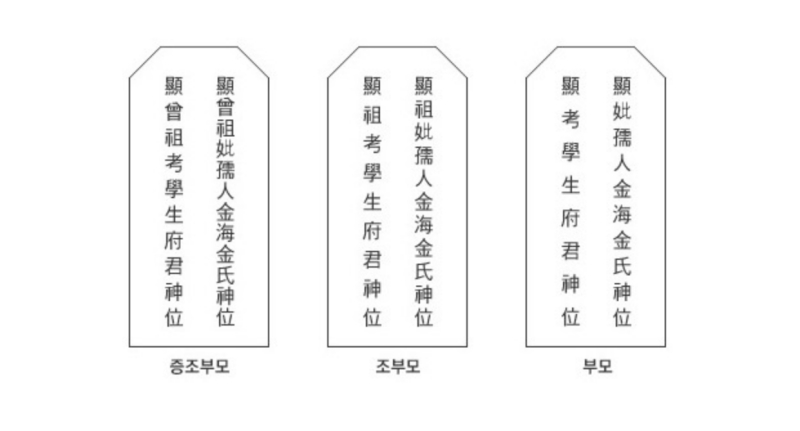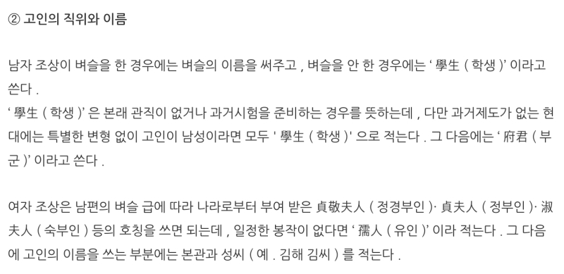 2. 관계 다음에는 고인의 직위와 이름을 적습니다. 과거에 벼슬을 했다면 그 관직명을 적지만, 벼슬을 하지 않은 남자 조상은 일반적으로 '학생(學生)'이라 씁니다. 여자 조상의 경우 남편의 직위에 따른 호칭이 있지만, 특별한 봉작이 없다면 '유인(孺人)'이라고 적습니다.