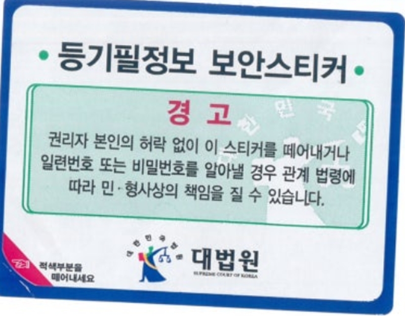 6. 등기필정보에는 고유번호와 비밀번호가 담긴 보안 스티커가 붙어있습니다. 이 정보는 전자 등기 신청 등에서 매우 중요하게 사용되므로, 서류를 보관할 때 이 스티커가 훼손되지 않도록 각별히 주의해야 합니다.