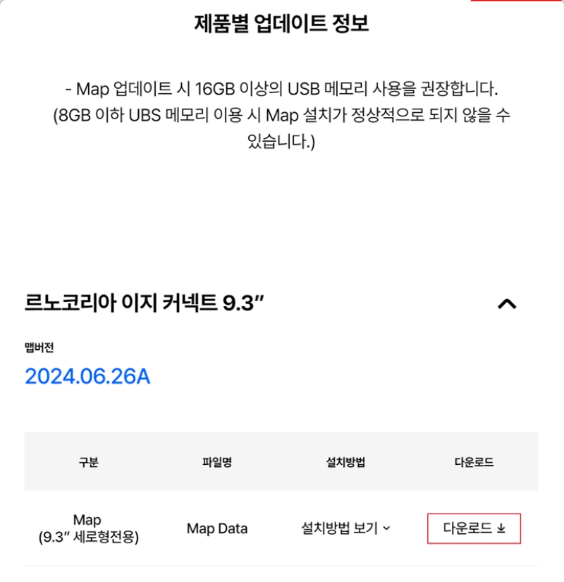 7. 마지막으로 제품 업데이트 정보에서 본인 차량에 맞는 파일을 확인하고 '다운로드'를 진행합니다. 16GB 이상의 USB 메모리를 사용하는 것이 권장됩니다.