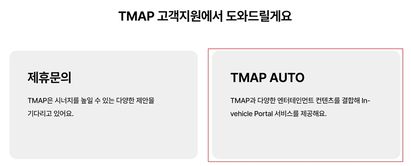 2. 고객지원 페이지로 이동하면 여러 선택지 중 'TMAP AUTO'를 고릅니다. 차량 내에서 사용하는 인포테인먼트 시스템과 관련된 내용을 다루는 곳입니다.