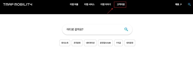 1. 티맵 모빌리티 홈페이지 상단에 있는 여러 메뉴 중에서 '고객지원' 항목을 찾아 들어갑니다. 이곳에서 다양한 지원 정보를 확인할 수 있습니다.
