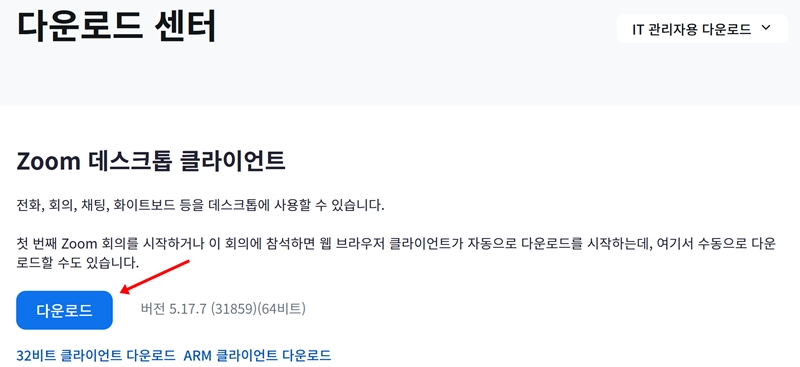 2. 다운로드 센터 페이지로 이동하면 설치 파일을 받을 수 있습니다. 파란색 '다운로드' 부분을 눌러 PC에 프로그램을 설치하는 과정을 시작합니다.