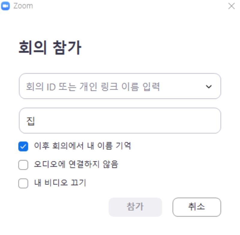 6. 다른 회의에 들어가려면 '참가'를 누른 후 전달받은 회의 ID나 링크를 입력합니다. 자신의 이름을 설정하고 오디오나 비디오 사용 여부를 미리 정할 수도 있습니다.