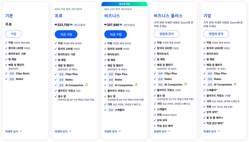 8. Zoom은 무료인 기본 요금제부터 더 많은 기능과 긴 미팅 시간을 지원하는 프로, 비즈니스 등 여러 유료 플랜을 갖추고 있어 필요에 따라 선택하여 이용할 수 있습니다.