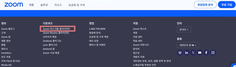 1. Zoom 홈페이지에 접속한 후 화면을 가장 아래로 내리면 여러 메뉴가 보입니다. 그중 '다운로드' 항목 아래에 있는 'Zoom 데스크톱 클라이언트'를 선택합니다.
