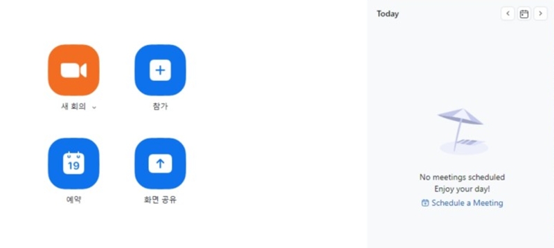 5. 로그인을 마치면 기본 화면이 나타납니다. 여기서 '새 회의'를 시작하거나, 다른 사람이 만든 회의에 '참가'하고, 앞으로의 일정을 '예약'하는 등 다양한 활동을 할 수 있습니다.