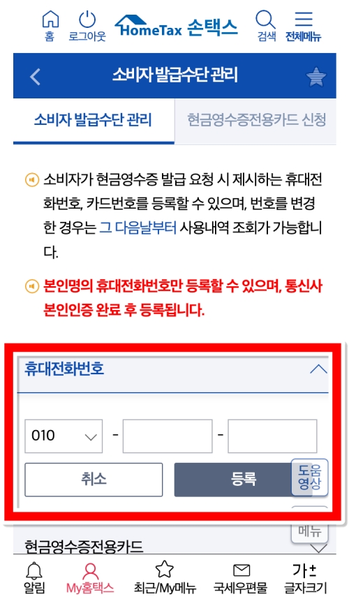 현금영수증 핸드폰 번호 등록 (전화번호)
