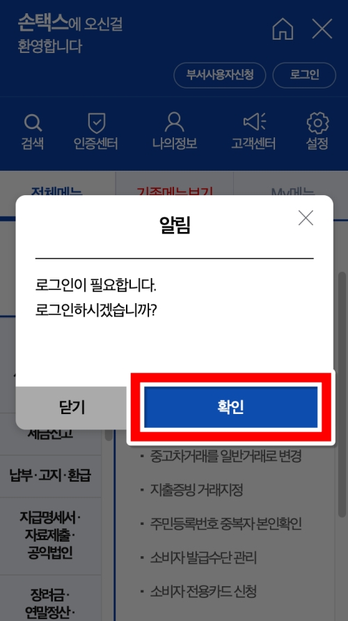 4. 해당 서비스를 이용하기 위해서는 로그인이 필요하다는 알림창 나타납니다. 내용을 확인한 후 '확인'을 누르면 로그인 화면으로 자연스럽게 이동하게 되니 걱정하지 않으셔도 괜찮아요.
