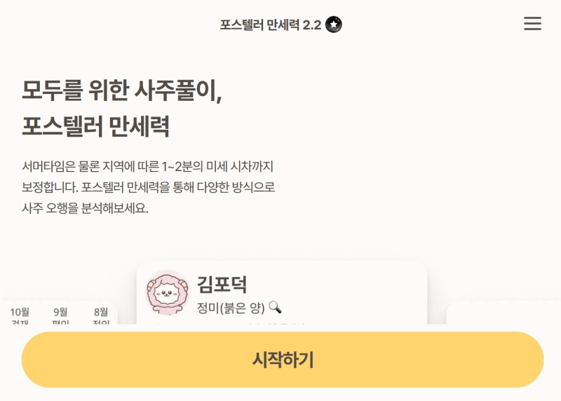 1. 홈페이지에 접속하여 화면 중앙의 '시작하기'를 누르면 본격적으로 나의 사주 정보를 확인하기 위한 여정이 시작됩니다. 이곳에서부터 나 자신을 알아가는 첫걸음을 뗄 수 있어요.