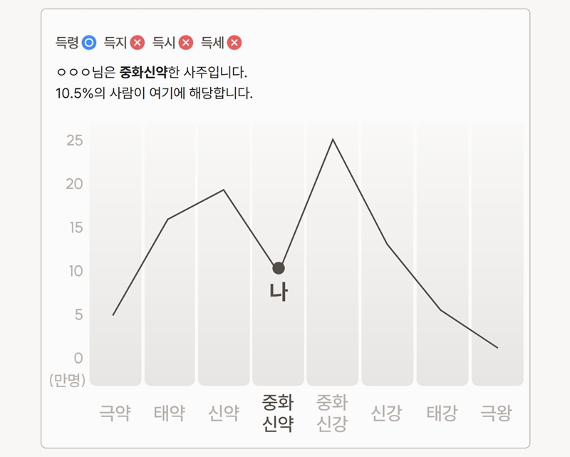 7. 나의 사주가 전체 인구 중에서 어느 정도의 강약을 지니는지 그래프로 보여주기도 해요. 이를 통해 다른 사람들과 비교하여 나의 기질적인 특성을 객관적으로 파악해 볼 수 있습니다.