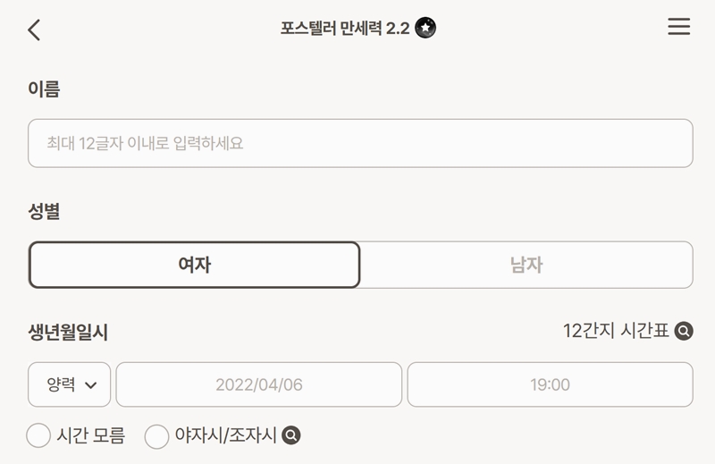 2. 이름과 성별, 그리고 가장 중요한 생년월일시를 정확하게 기입해야 해요. 양력과 음력 중 하나를 선택하고, 태어난 시간까지 입력하면 더욱 상세한 분석 결과를 얻을 수 있습니다.