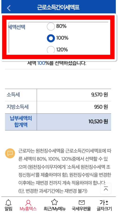8. 조회 결과 화면에서는 납부할 세액의 80%, 100%, 120% 중 하나를 선택할 수 있습니다. 일반적으로 100%를 기준으로 소득세와 지방소득세가 결정되며, 최종적으로 납부할 세액의 합계액을 확인할 수 있습니다.