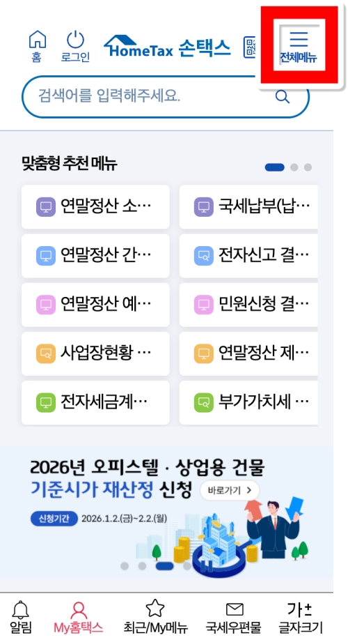1. 스마트폰에서 국세청 홈택스 모바일 웹사이트에 접속한 뒤, 화면 오른쪽 상단에 위치한 '전체메뉴'를 선택해 주세요. 홈택스의 모든 서비스를 한눈에 볼 수 있는 메뉴가 나타납니다.